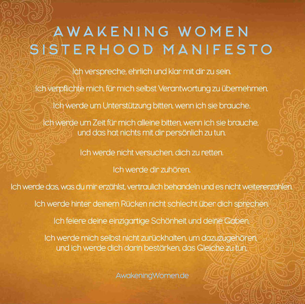 Bei Awakening Women beziehen wir Stellung für ein bewusstes Miteinander von Frauen: Im Feiern, Ermächtigen, und in wahrer Schwesternschaft. Wir halten uns an das Manifest unserer Schwesternschaft, einer Zusammenstellung von Vereinbarungen, die wir für uns selbst üben und im Umgang miteinander.